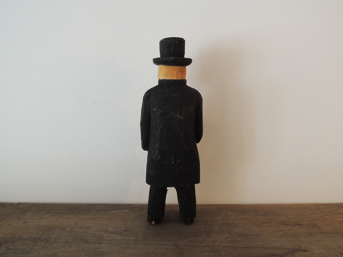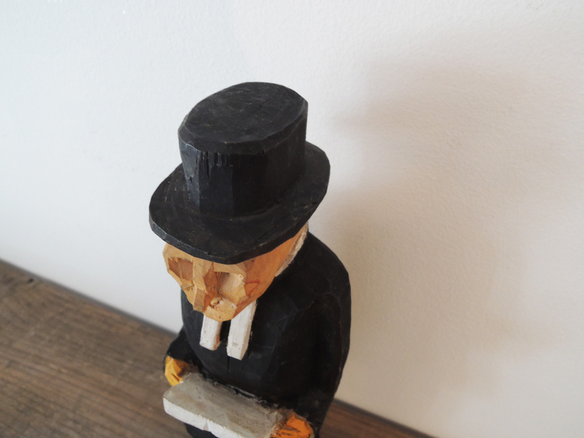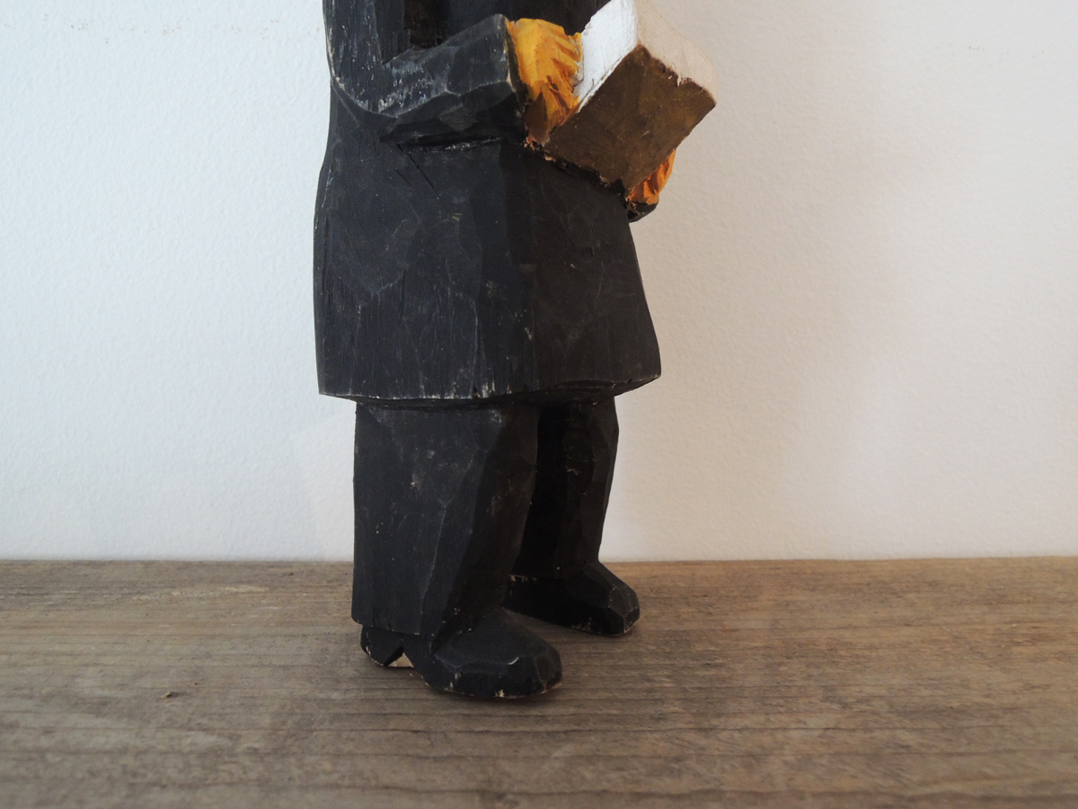 スウェーデンのアンティーク屋さんでよく見かけるこの手の木彫人形。モチーフは常に庶民的な人々で、おじいちゃんおばあちゃん、働らくおじさんおばさん、気持ち良さそうに酔っぱらった人などがユーモラスに表現されています。精巧な技術の工芸品にはない素朴な魅力でついつい集めてしまうコレクターがきっと多いのでしょうね。こちら勝手に「田舎牧師」と命名させていただきました。