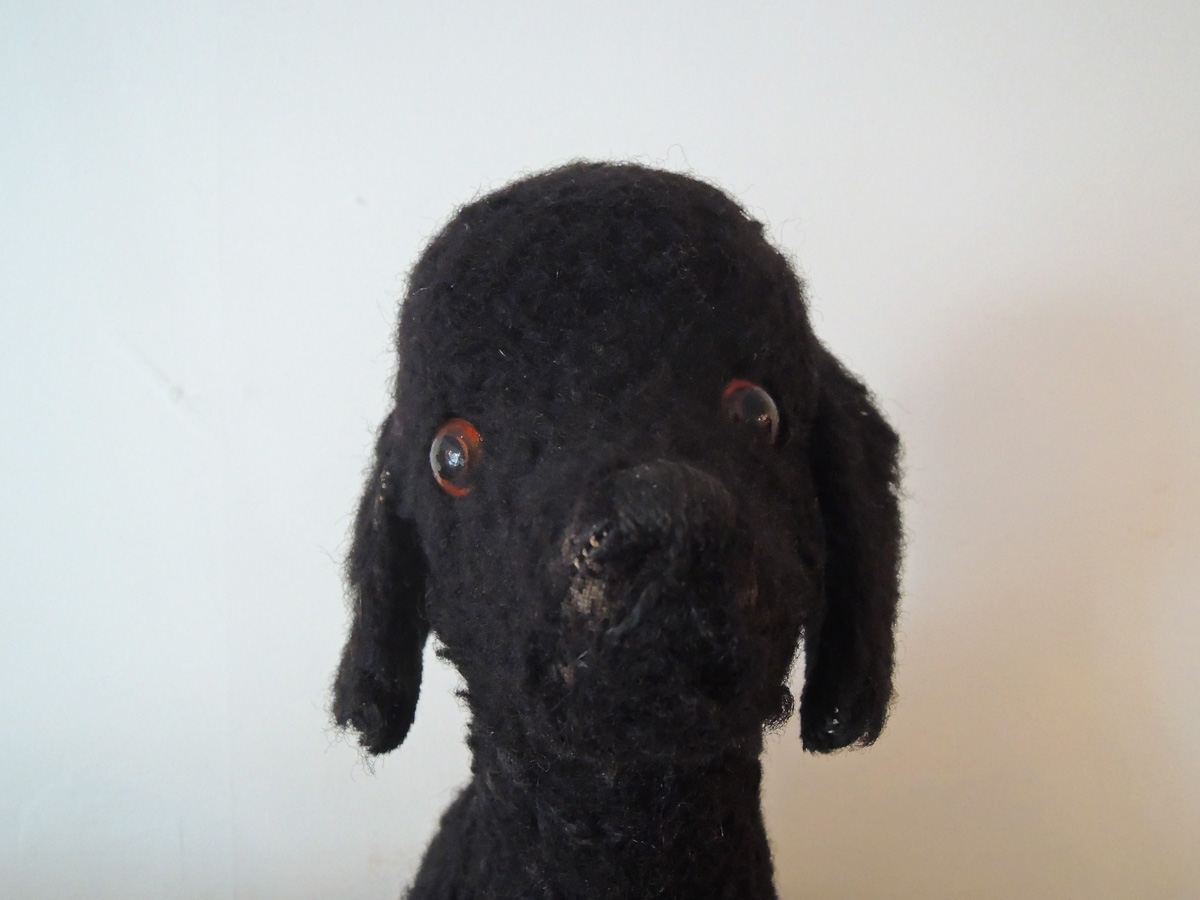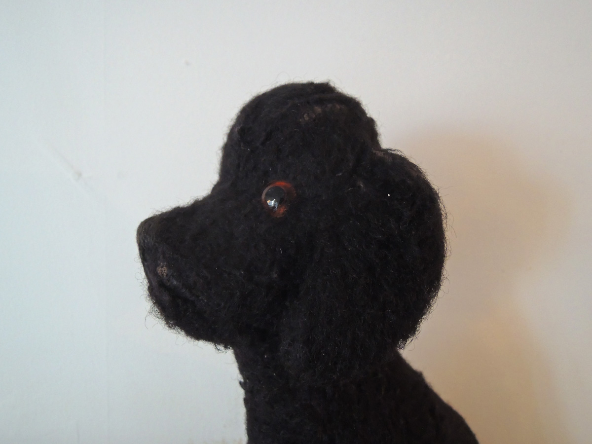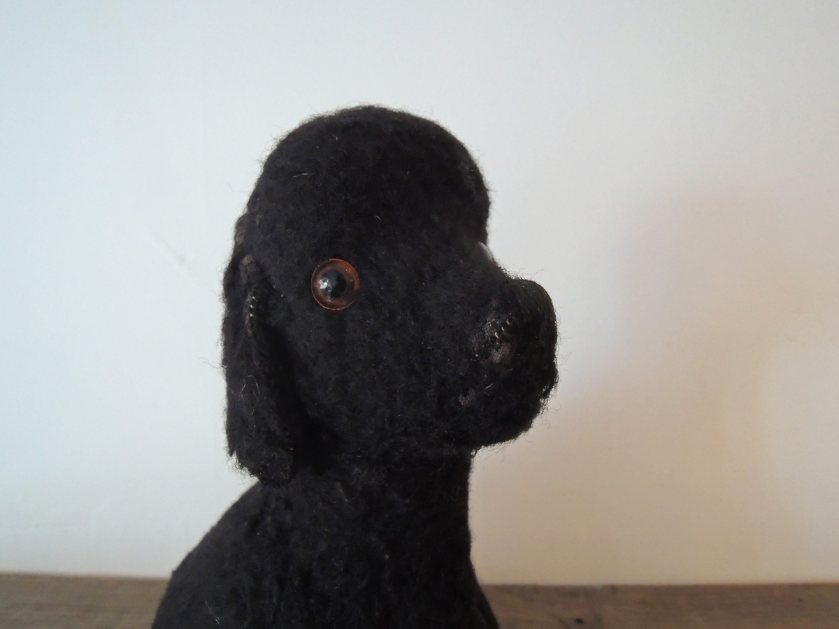 イギリスで出会った黒プーのぬいぐるみ。専門ではないので、これがイギリス製なのかドイツ製なのか判断できませんが、かわいい子だということはわかります。中には藁(わら)が詰まっていて、目はグラスアイです。鼻、耳、頭部など数カ所きれいに補修されています。
